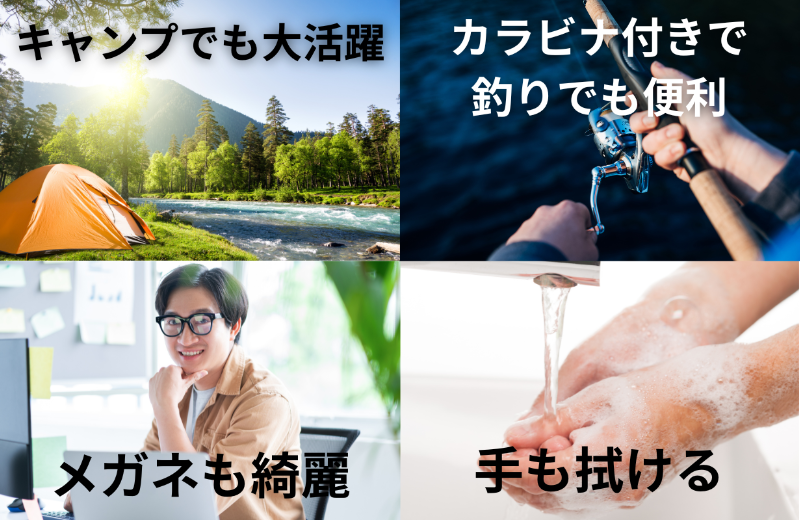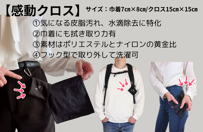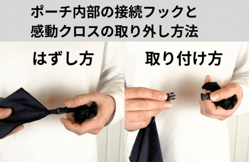 カラビナをはずし、ポーチ内部に指を入れ、クロスだけでなく、ポーチ本体でそのまま綺麗に拭き取ることも可能です。