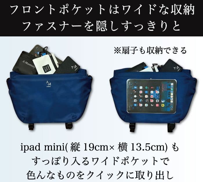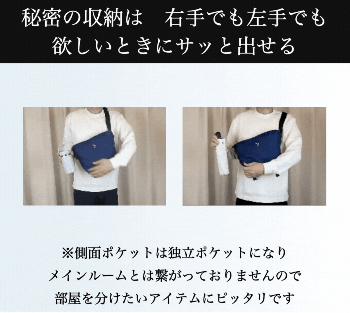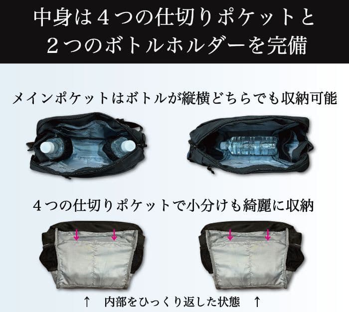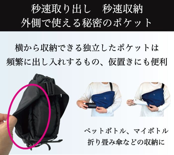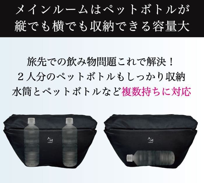 縦収納対応の「秘密のポケット」と、縦収納対応の「メインポケット」でボトル問題を解消