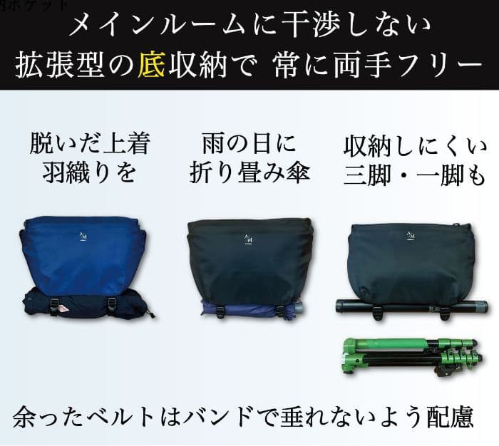 脱いだ上着、折り畳み傘、一脚、三脚、ジンバルまで。収納しにくいものはバッグ底の頼れる拡張収納に