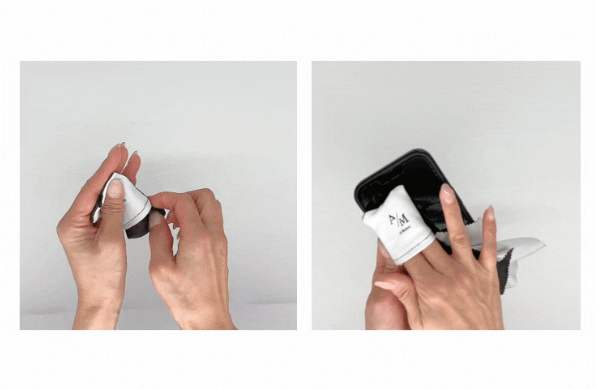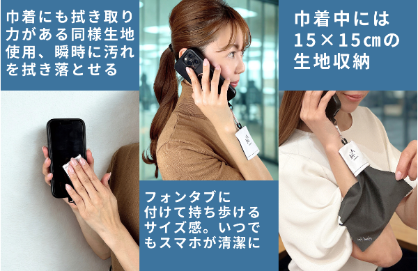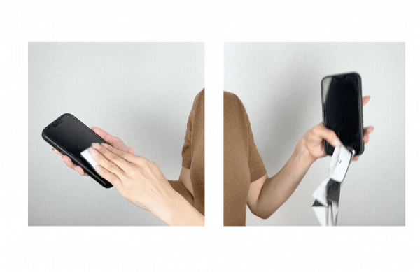 - カラビナ付でスマホに装着できるので、気になった瞬間に「サッ」と拭けて、清潔がいつもすぐそばに。