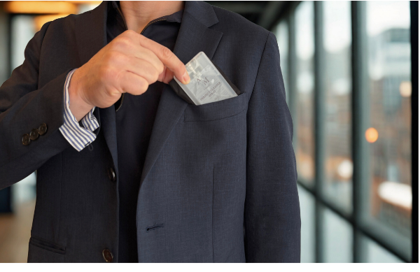 「鮮明スプレー」はカード型で、スーツの胸元ポケットにもピッタリ。コンパクトに薄く携帯可能です。